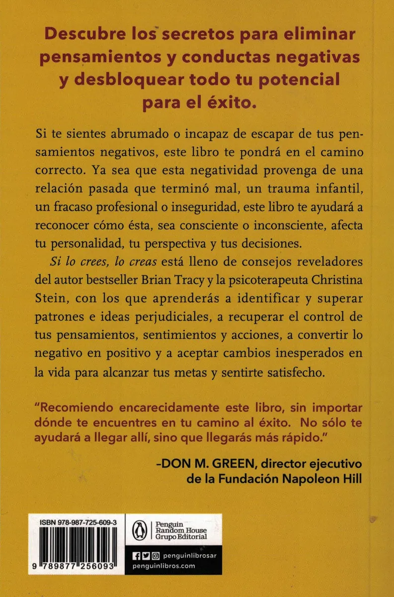 Descubre los secretos para eliminar pensamientos y conductas negativas y desbloquear todo tu potencial para el éxito. Si te sientes atrapado, abrumado o incapaz de escapar de tus pensamientos negativos, este libro te pondrá en el camino correcto. Ya sea que esta negatividad provenga de una relación pasada que terminó mal, un trauma infantil, un fracaso professional o simple inseguridad, este libro te ayudará a reconocer cómo la negatividad consciente (y muchas veces inconsciente) afecta tu personalidad, tu perspectiva y tus decisiones. Si lo crees, lo creas está lleno de consejos reveladores del autor bestseller Brian Tracy, junto con el asesoramiento de la psicoterapeuta Christina Stein; aprenderás a identificar y superar patrones e ideas perjudiciales, a recuperar el control de tus pensamientos, sentimientos y acciones, a convertir lo negativo en positivo y a aceptar câmbios de vida inesperados sin caer en viejos patrones negativos para alcanzar tus metas y sentirte satisfecho. #Recomiendo encarecidamente este libro, sin importar dónde te encuentres en tu camino al éxito