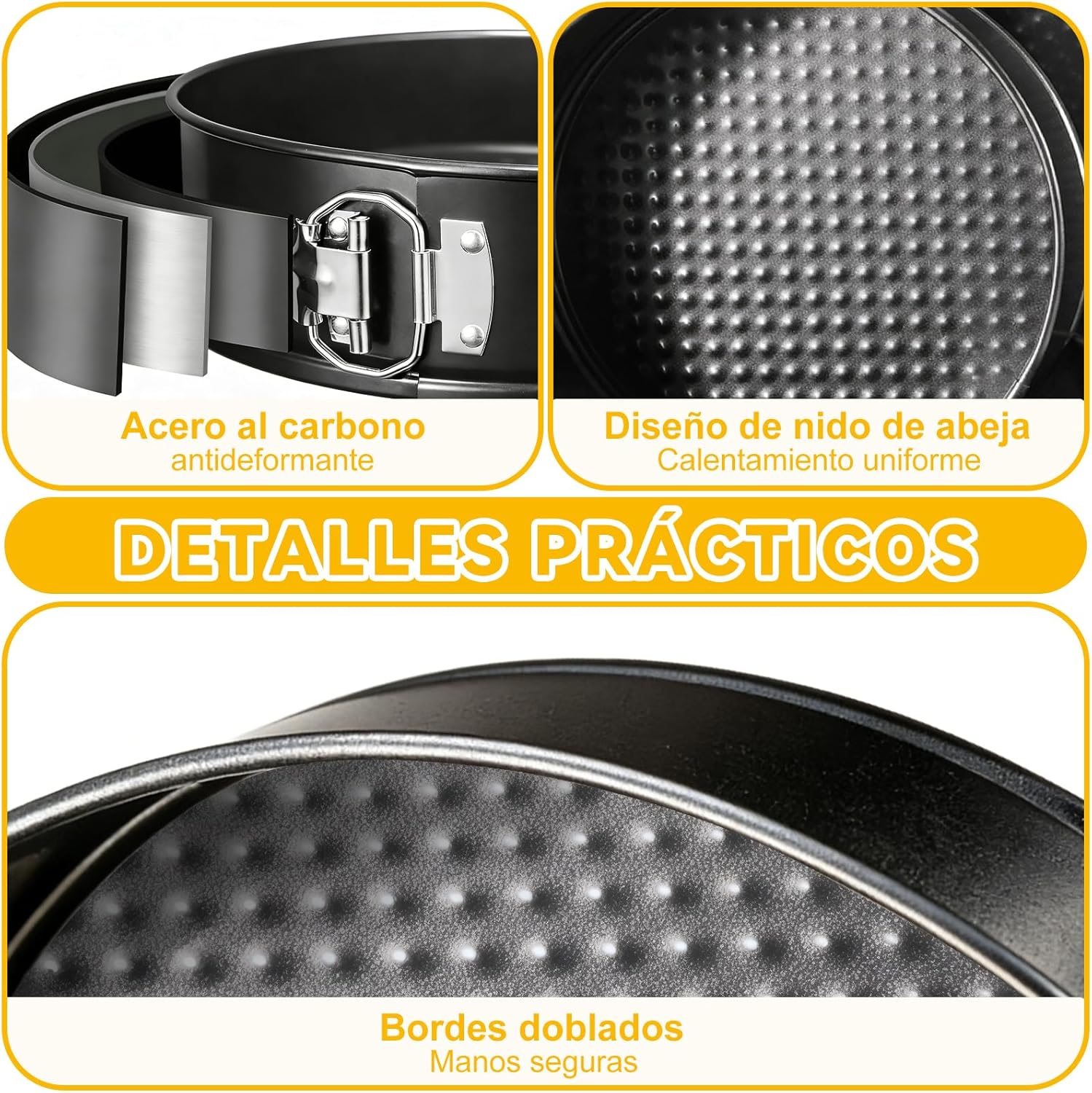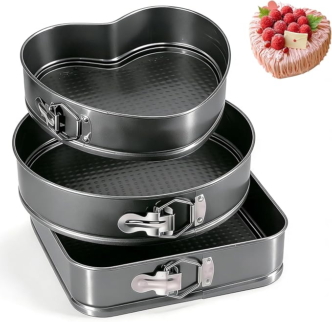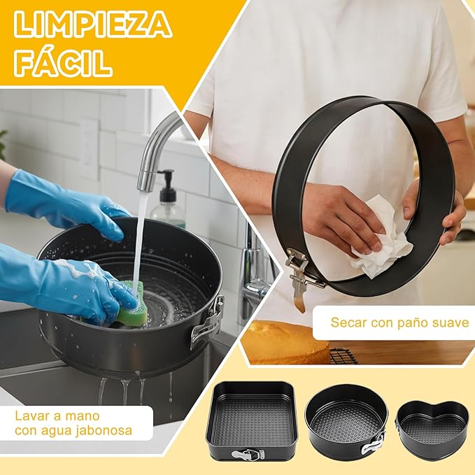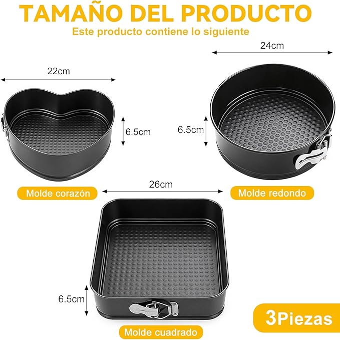 Set de moldes para pastel fabricados en acero al carbono con recubrimiento antiadherente que facilita el desmolde y la limpieza. Incluye tres formas diferentes, ideales para repostería casera o profesional. Son resistentes, prácticos y permiten horneado uniforme.